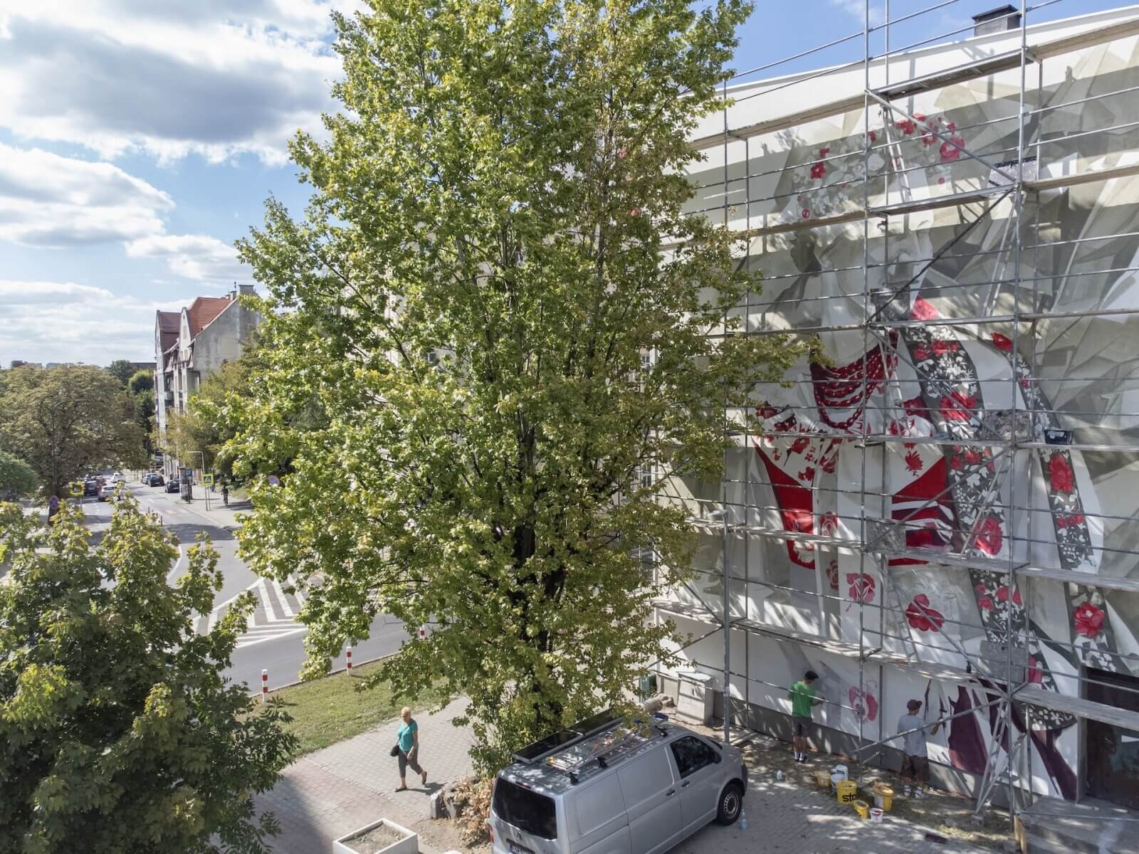 Powstający z okazji 770-lecia nadania praw miejskich Bytomiowi, wielkoformatowy portret kobiety w stroju rozbarskim nabiera już kształtów. Na ścianie kamienicy przy ul. Witczaka 42 pojawiły się rusztowania, a na nich Łukasz Chwałek z Jakubem Bitkiem. Obaj mają na swoim koncie tysiące metrów kwadratowych ozdobionych muralami ścian. Streetartowcy z Zielonej Góry wykorzystują farby elewacyjne silikonowe.