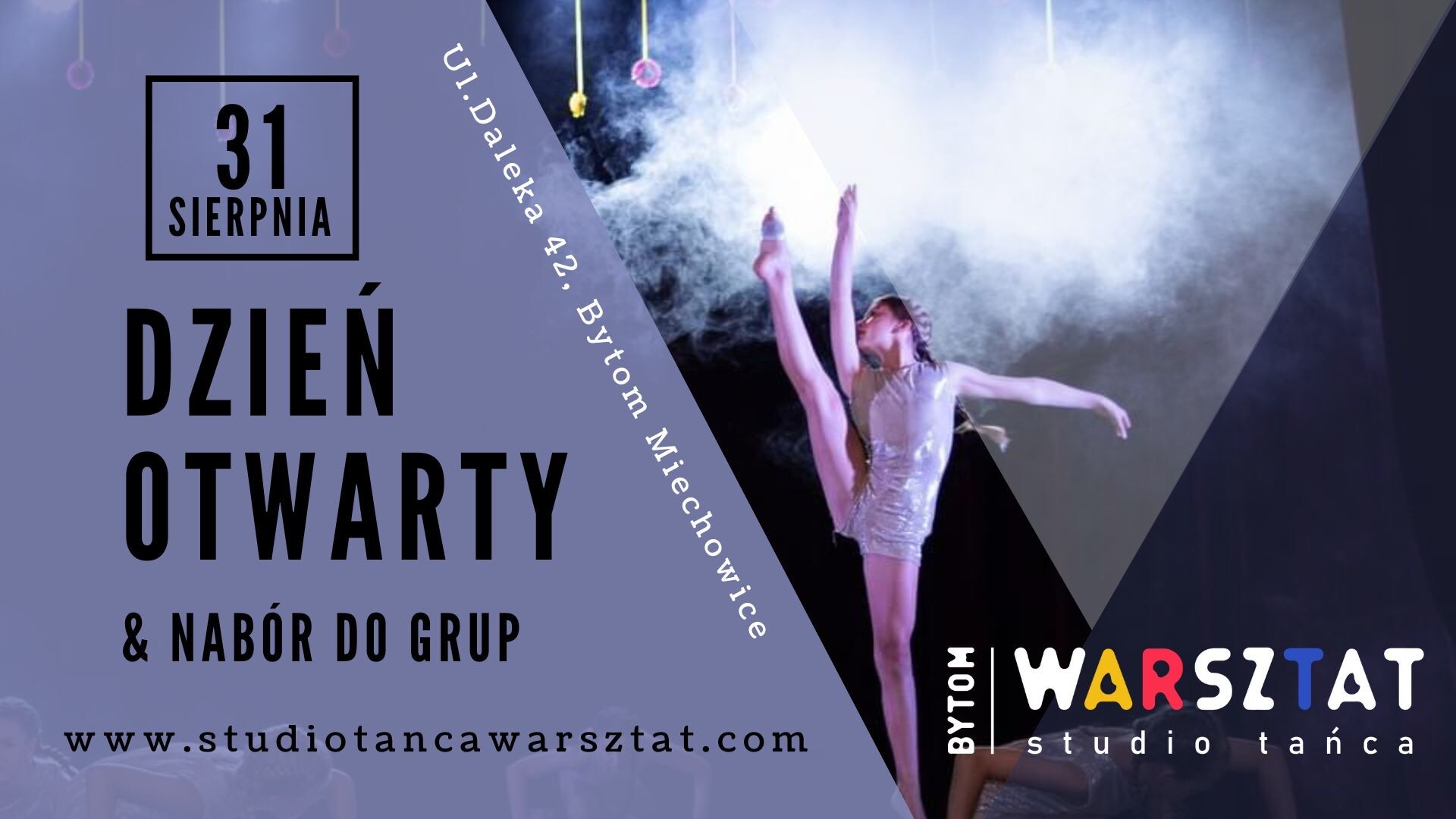 Bytomskie Studio Tańca Warsztat to miejsce, w którym pasja do tańca i ruchu, przeplata się z pozytywną energią. Studio prowadzi zajęcia taneczne oraz akrobatyczne, kierowane do dzieci od 3. roku życia, młodzieży, a nawet osób dorosłych.