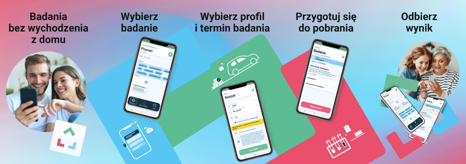 - Badania laboratoryjne: W zależności od wybranych badań, nasz wykwalifikowany personel pobiera krew, wymaz, mocz lub kał w miejscu i terminie wybranym przez Pacjenta. Próbki zostają zawiezione do laboratorium. Wyniki badań są generowane w pliku pdf, bezpośrednio w aplikacji. Jest to wspaniała opcja w szczególności dla ciężarnych, osób z ograniczoną mobilnością, dzieci bojących się igieł, a także ludzi zapracowanych.